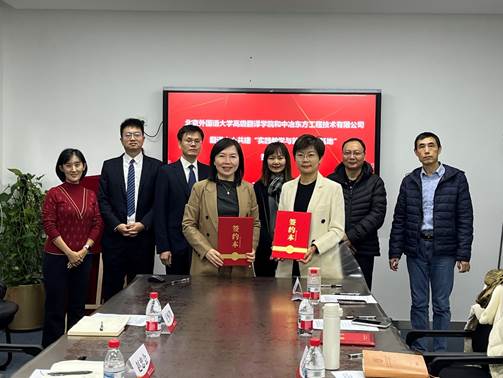 2025年11月12日下午,高级翻译学院与中冶东方工程技术有限公司翻译中心举行共建“实践教学与就业实习基地”签约仪式。高翻学院党总支书记王薇薇、院长任文、副院长李长栓、姚斌、学生实习实践中心主任王苏阳,中冶东方翻译中心主任赵忠会、行政事务部部长李敏、生产运营总监白玉东、人力资源部长王怀望出席。