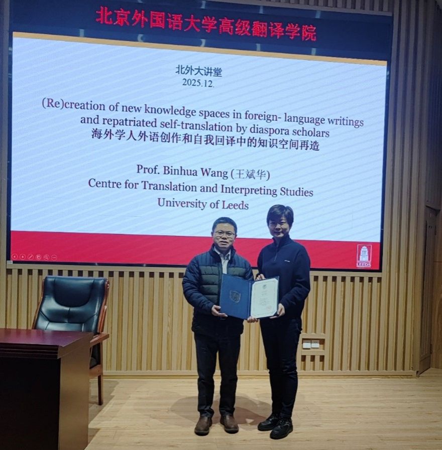 2025年12月1日晚,英国利兹大学王斌华教授应邀做客北外大讲堂,以“海外学人外语创作和自我回译中的知识空间再造”为题展开深度分享。讲座开始前,高级翻译学院党总支书记王薇薇为王斌华教授颁发了冠名讲席教授证书。讲座由院长任文教授主持。