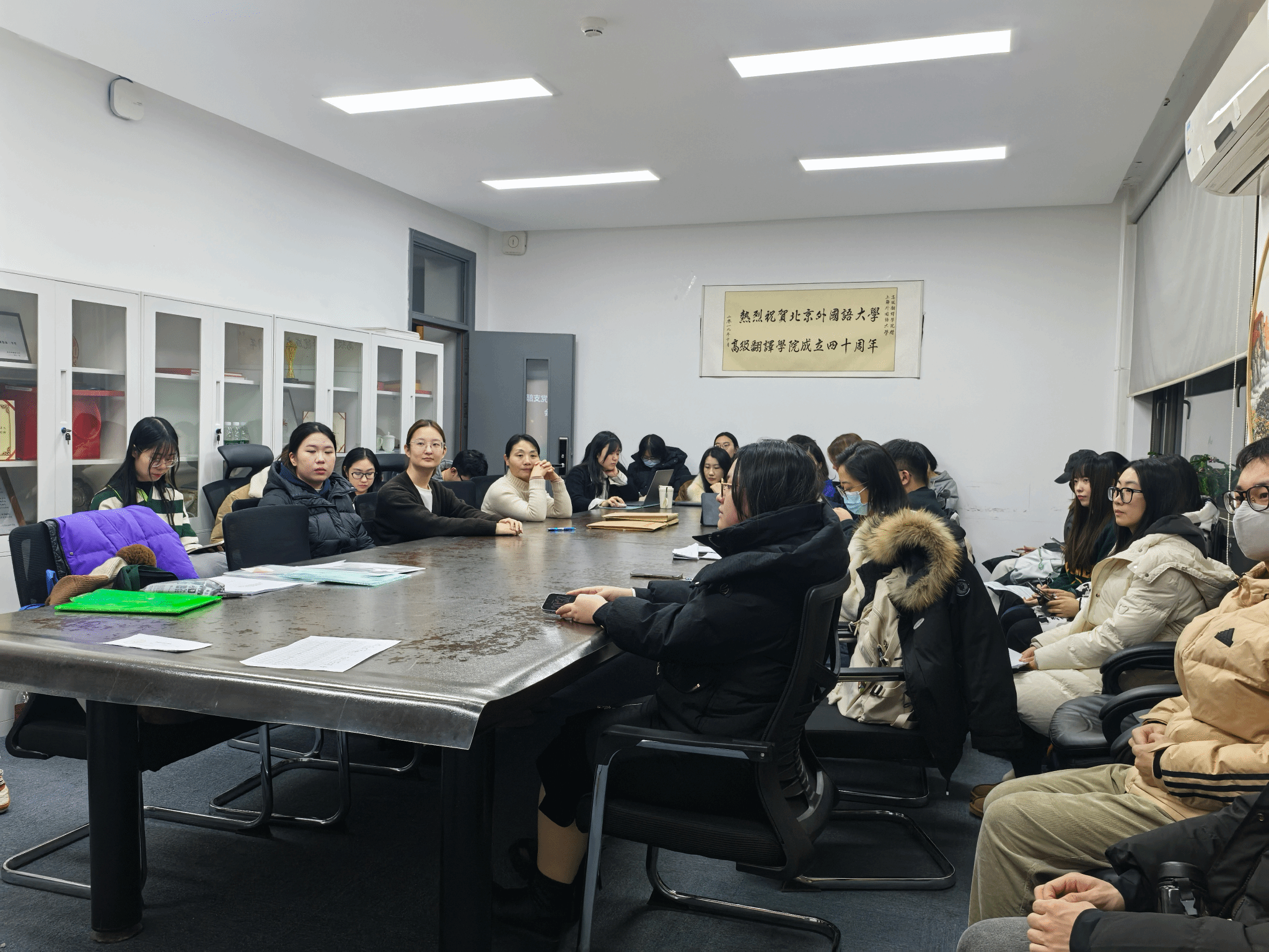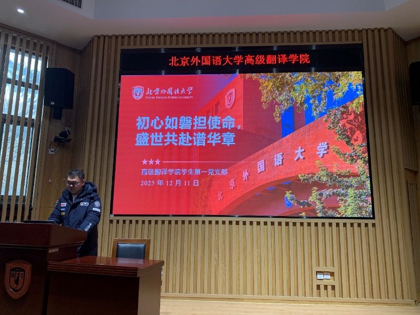 12月11日,学生第一党支部在224教室召开“初心如磐担使命,盛世共赴谱华章”专题研讨会,支部书记王茂兴带领重温主题党课内容、深入学习习近平总书记关于中国梦的重要论述。党员与入党积极分子围绕党的历史地位、中国式现代化展开热议,结合翻译技术、跨文化传播等专业方向,探讨如何以精准译介讲好中国故事,将专业所长转化为助力民族复兴的实践力量。