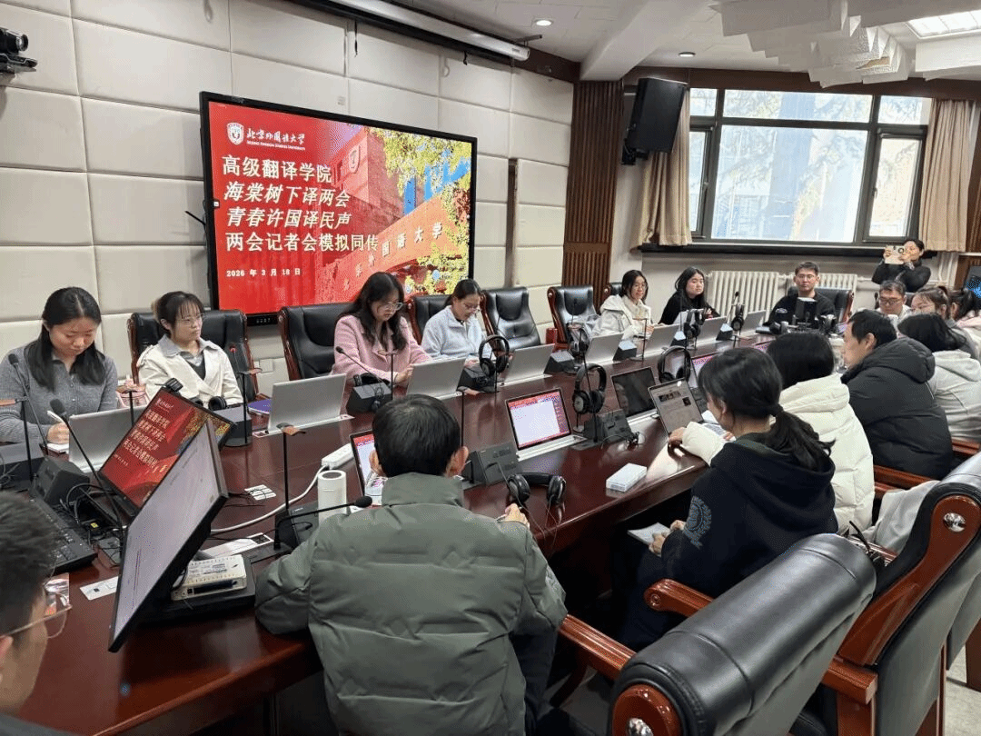为学习2026年全国两会精神,锤炼口译专业技能,3月18日,高级翻译学院在122教室举办“海棠树下译两会,青春有为传民声”模拟同传活动。高级翻译学院副院长姚斌教授、口译教育与实践研究中心主任卢信朝教授出席活动并全程指导,学院各年级学生积极参与此次实战演练,以专业实践践行青年担当。