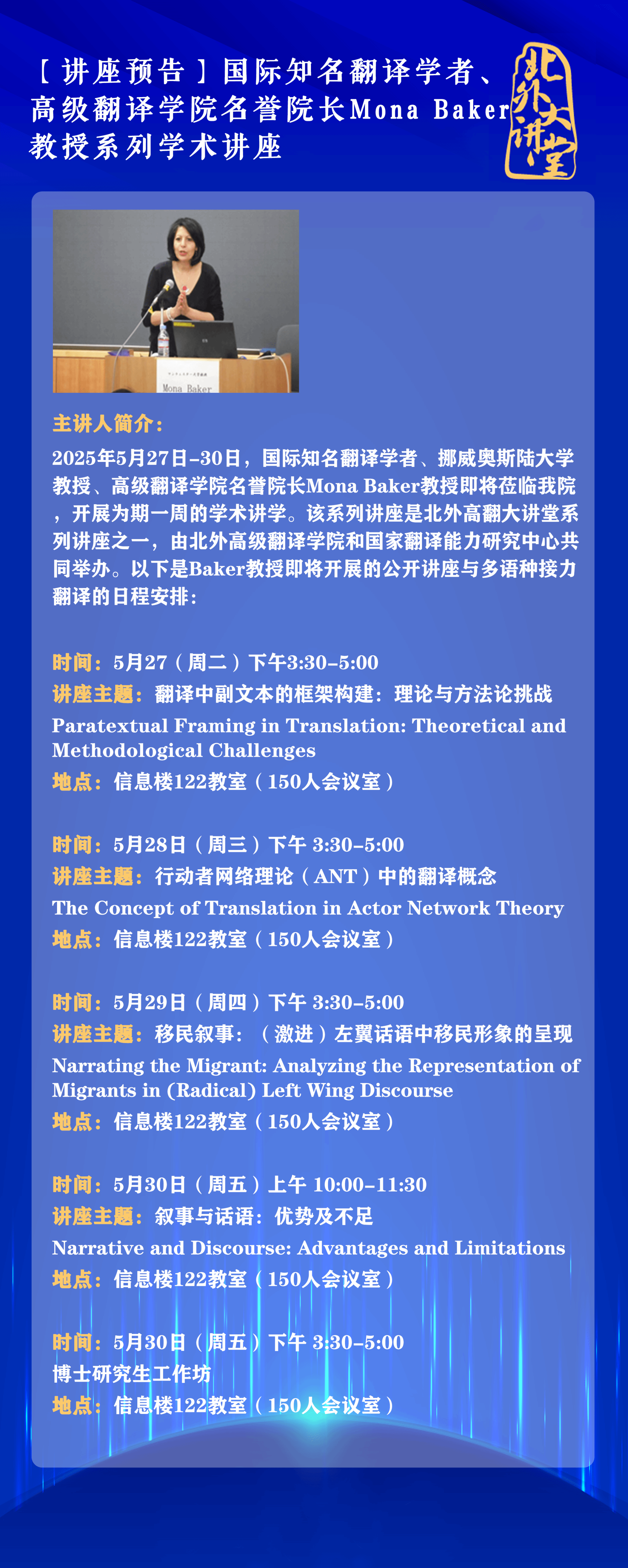 2025527-30日,国际知名翻译学者、挪威奥斯陆大学教授、高级翻译学院名誉院长Mona Baker教授即将莅临我院,开展为期一周的学术讲学。该系列讲座是北外高翻大讲堂系列讲座之一,由北外高级翻译学院和国家翻译能力研究中心共同举办。以下是Baker教授即将开展的公开讲座与多语种接力翻译的日程安排: